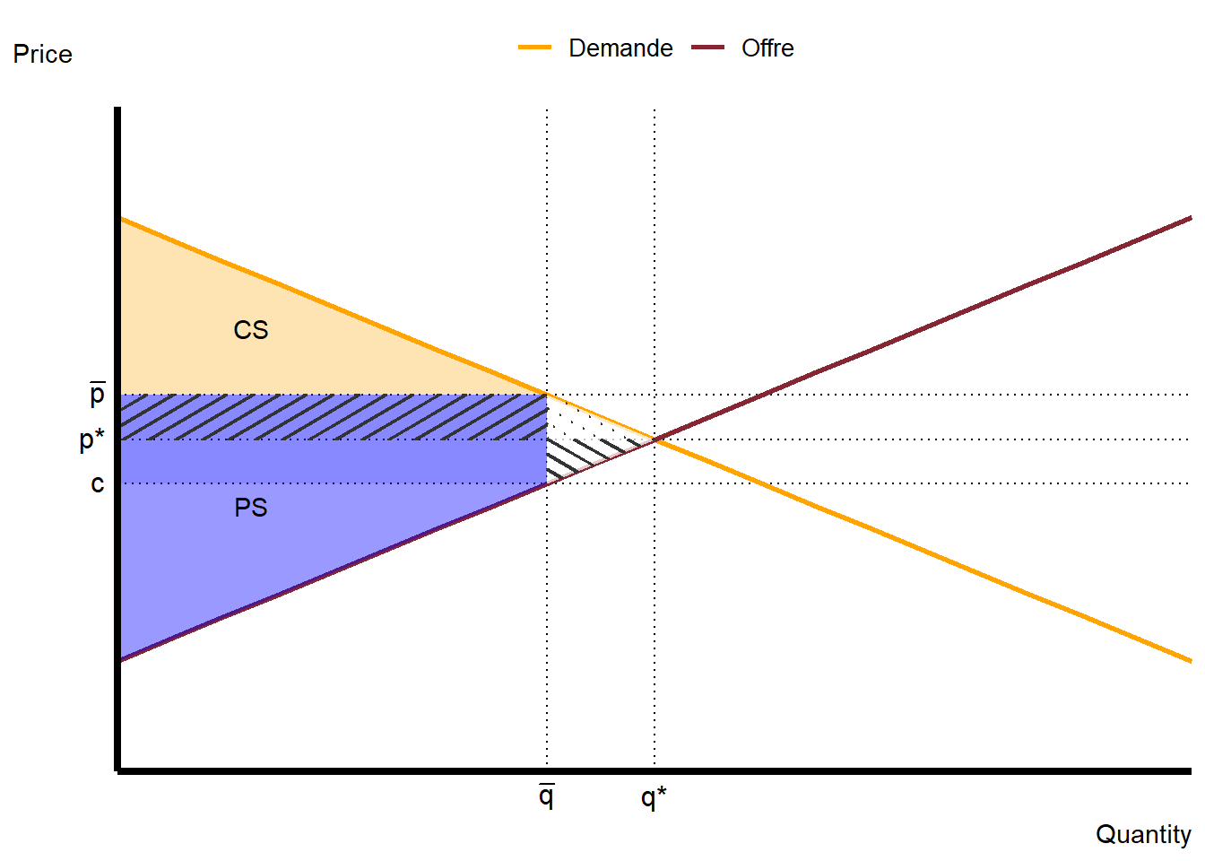 Le surplus total avec le quota de production est plus faible de la somme du triangle pointillé et du triangle hachuré. C’est la perte sèche du quota, signifiant une perte de bien‑être pour la société.