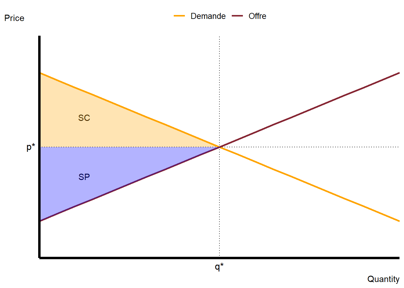 La zone en jaune est le surplus du consommateur (SC). Il représente le bénéfice tiré par les consommateurs de l’achat d’une quantité \(q^\star\) à un prix \(p^\star\). La zone en violet est l’surplus du producteur (SP), soit le bénéfice tiré par les producteurs de la vente de \(q^\star\) à un prix \(p^\star\). Il ne s’agit pas du profit. La somme de l’sC et de l’sP est le surplus total (ST), c’est‑à‑dire le bénéfice total pour la société d’une quantité \(q^\star\) à un prix \(p^\star\).