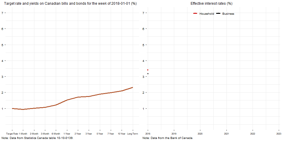 The next animation displays the effective interest rates paid by households and businesses on the right panel. It shows how the Bank of Canada quantitative tightening measures and increases of its policy rate tightened credit conditions for households and businesses. Interestingly, the household average interest rate has flipped back above the average business interest rate recently.