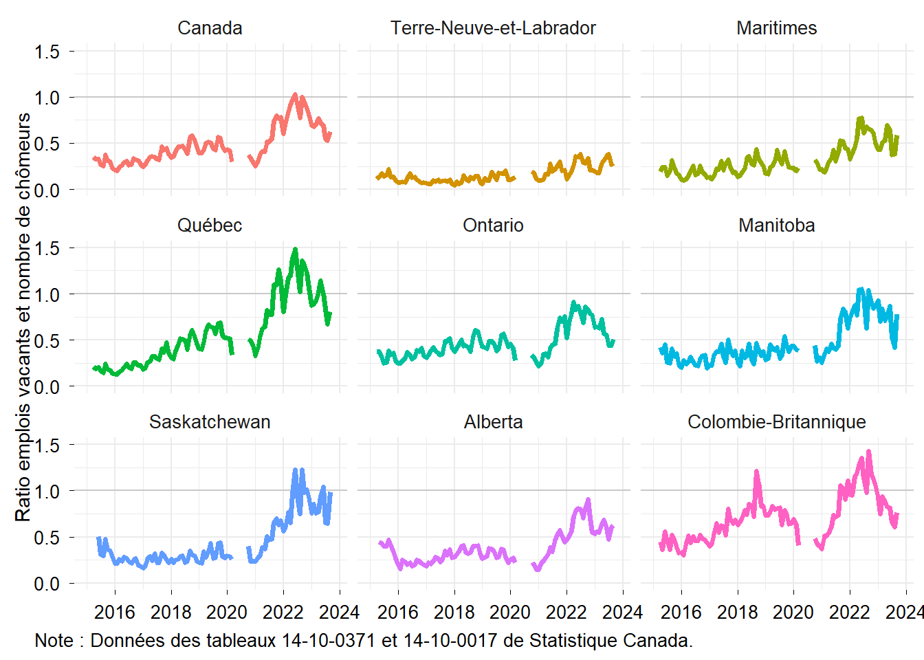 La figure ci-dessous montre que le ratio a atteint un sommet au milieu de l’année 2022. Le marché du travail était particulièrement serré au Québec et en Colombie-Britannique, mais s’est affaibli au cours de la dernière année, en partie à cause de l’afflux d’immigrants. Néanmoins, il est toujours fort par rapport à avant la pandémie.