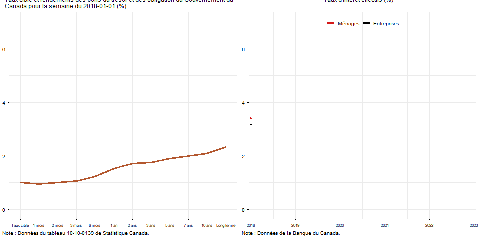 L’animation suivante montre les taux d’intérêt effectifs payés par les ménages et les entreprises sur le panneau de droite. L’animation met en évidence comment les mesures de resserrement quantitatif et l’augmentation du taux directeur par la Banque du Canada ont causé un resserrement dans les conditions de crédit pour les ménages et les entreprises. Il est intéressant de noter que le taux d’intérêt moyen des ménages est récemment repassé au-dessus du taux d’intérêt moyen des entreprises.
