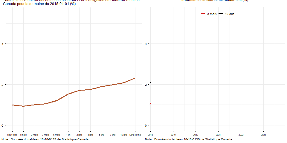 L’animation ci-dessous montre la courbe des taux entre janvier 2018 et novembre 2023 en deux panneaux. Le panneau de gauche montre la courbe des rendements : sur l’axe horizontal se trouve la maturité qui augmente de gauche à droite et sur l’axe vertical se trouve les rendements. Le panneau de gauche compare les rendements des bons du Trésor à 3 mois et de l’obligation à 10 ans pour déterminer lorsqu’il y a inversion. La zone en bleu montre l’écart lorsque le rendement de l’obligation à 10 ans dépasse celui des bons du Trésor à 3 mois. La zone en orange indique l’écart lorsque le rendement de l’obligation à 10 ans est inférieur à celui des bons du Trésor à 3 mois, c’est-à-dire lorsque la courbe de rendement est inversée.