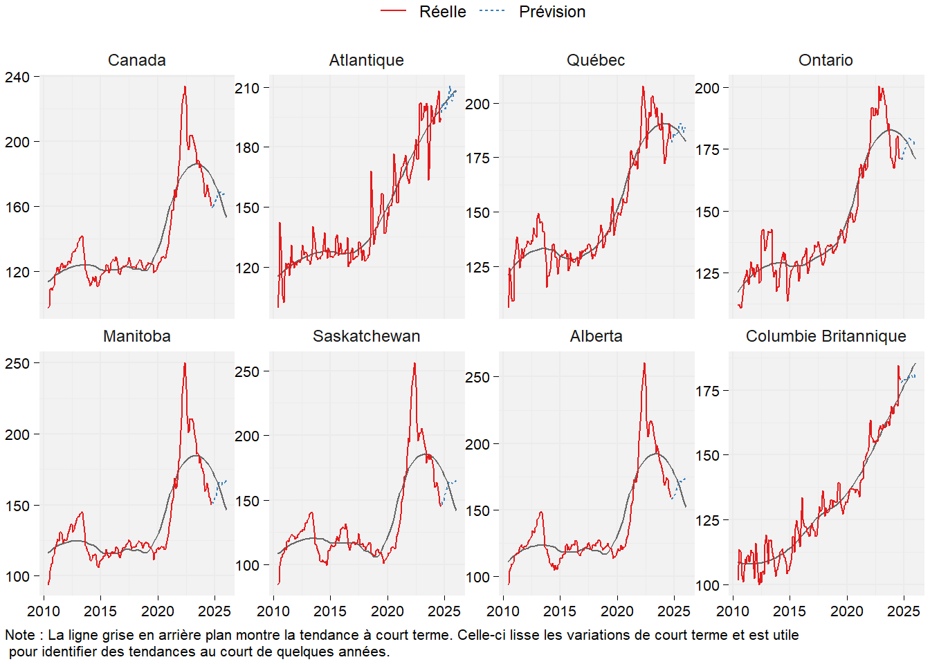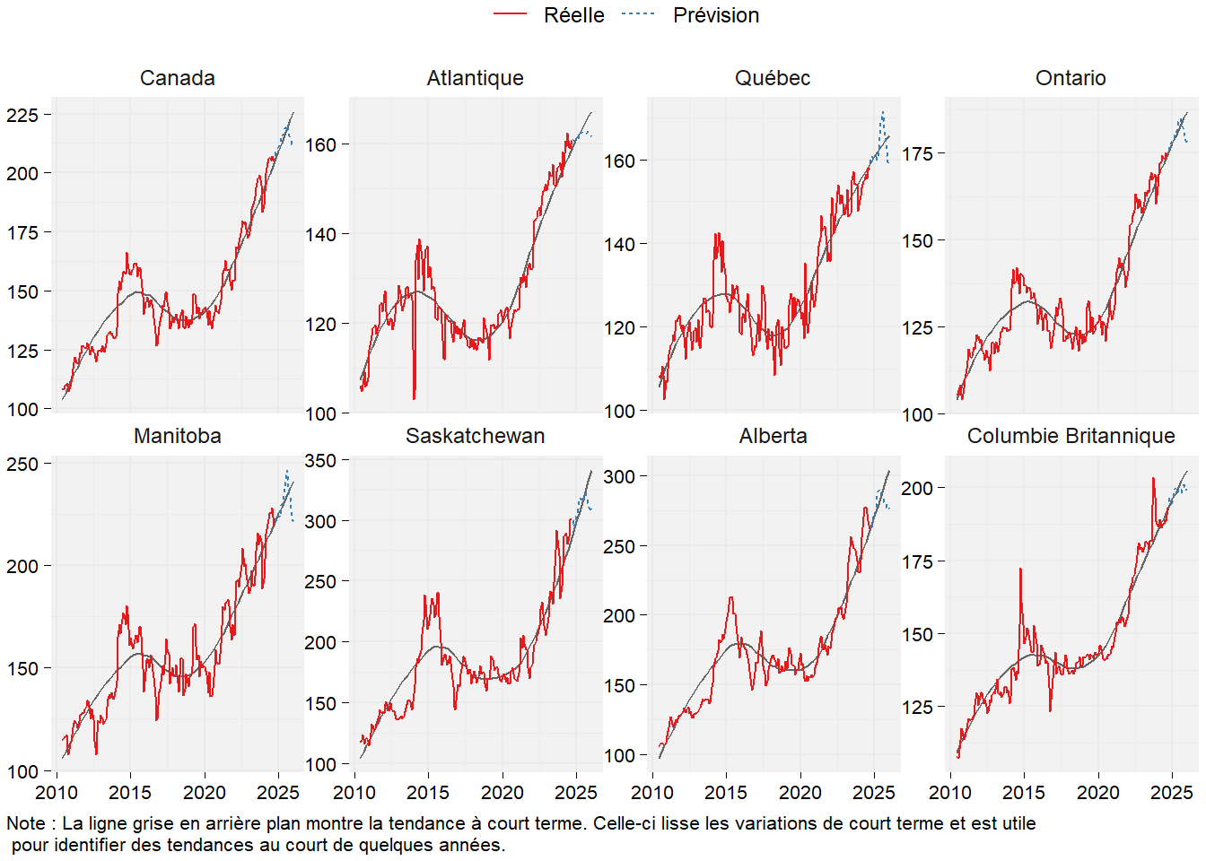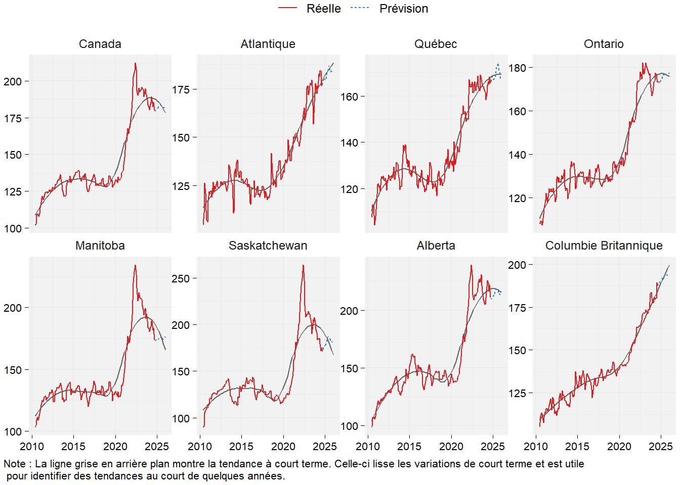 En ce qui concerne les indices des prix agricoles totaux, nous observons que dans les provinces qui dépendent davantage des grandes cultures, en particulier le Manitoba et la Saskatchewan, les prix ont atteint un sommet en 2022, puis ont diminué depuis. L’autre province des Prairies, l’Alberta, a un important secteur des cultures, mais aussi un important secteur bovin. Les prix ont diminué dans cette province, mais dans une moindre mesure qu’au Manitoba et en Saskatchewan. Le Québec et l’Ontario ont des productions agricoles diversifiées et les prix ont stagné depuis 2022, mais ils ont été volatils. Pour l’Atlantique et la Colombie-Britannique, les prix ont généralement suivi une tendance à la hausse depuis 2010.