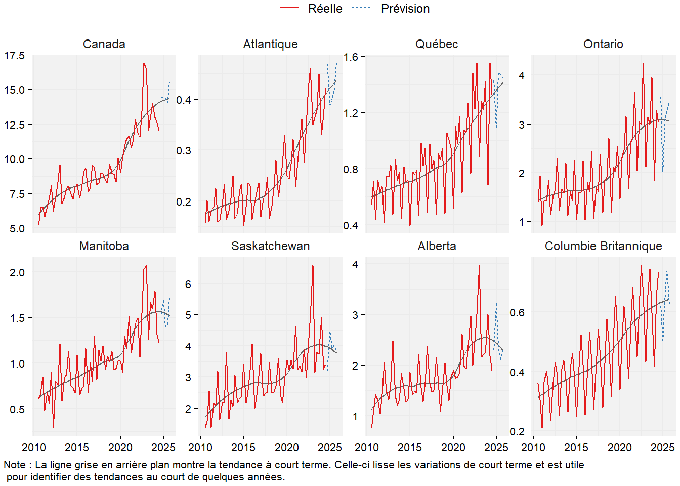 Le sommet de 2022 dépend du mélange de cultures de chaque province. Dans les Prairies, les grandes cultures occupent une grande part de la production et nous observons des pics beaucoup plus importants dans ces provinces. Au Québec et en Ontario, les pics sont plus petits, car les productions de fruits et légumes y sont relativement plus importantes.